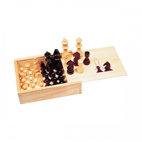 Πλήρες σετ από 32 ξύλινα πιόνια με ύψος βασιλιά 63 mm σε ξύλινο κουτί με συρτάρι.