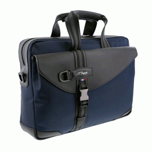 Defi Millenium S.T. Dupont διπλός χαρτοφύλακας από μαλακό σκούρο μπλε νάιλον και μαλακό μαύρο δέρμα. Μπλε λευκή κόκκινη κορδέλα Υψηλής απόδοσης νάιλον εξαιρετικά ανθεκτικό στις γρατζουνιές, ανθεκτικό στη βαφή, αδιάβροχο και ανθεκτικό στην υπεριώδη ακτινοβολία. Δερμάτινες πλάκες με S.T. Το λογότυπο Dupont ανάγλυφο. Χαρακτηριστικά: Εσωτερικές λειτουργίες: Κασετίνα για φορητό υπολογιστή. Εσωτερική τσέπη με φερμουάρ. 2 θέσεις για στυλό και μια ανοικτή τσέπη (μπροστινή τσέπη). Εξωτερικές λειτουργίες: Διπλό κλείσιμο με φερμουάρ, 1 πτερύγιο με σύστημα κλεισίματος. Έξυπνο μανίκι. Αξεσουάρ: αφαιρούμενος ιμάντας ώμου.