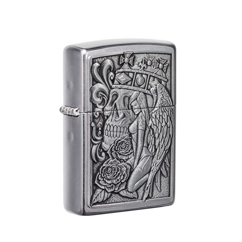Ο θάνατος και η ζωή γίνονται ένα σε αυτό το σχέδιο με έμβλημα που απεικονίζει μια νεκροκεφαλή με στέμμα κι έναν άγγελο. Τριαντάφυλλα και φιλιγκράν πλαισιώνουν το σχέδιο και προσθέτουν μια πινελιά κομψότητας σε αυτό το "σκοτεινό" κομμάτι. Αυτό το έμβλημα γοτθικού στιλ έχει εφαρμοστεί σε αναπτήρα Street Chrome ™.