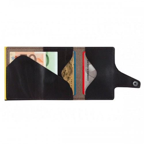 Το πατενταρισμένο πορτοφόλι TRU VIRTU® “CLICK & SLIDE”  δεν είναι πολύ μεγαλύτερο από μια πιστωτική κάρτα. Με ένα μόνο άγγιγμα του αντίχειρά σας και χωρίς να ανοίξετε το πορτοφόλι, οι κάρτες σας αυτόματα γλιστρούν έξω σε κλιμακωτή θέση.