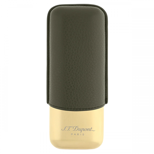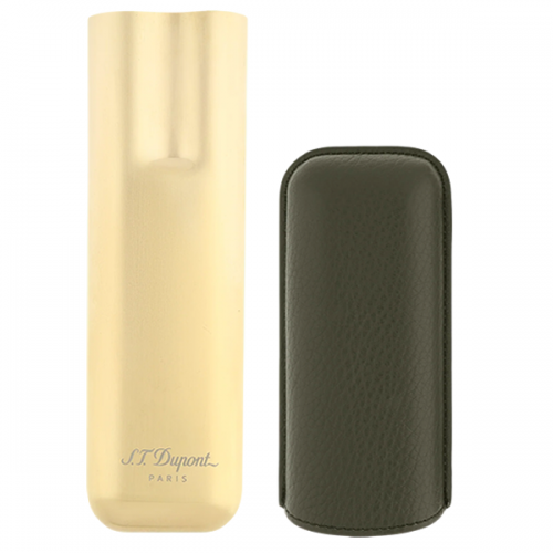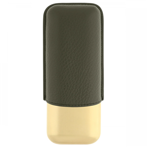 Κομψή θήκη για δύο πούρα (Double Cigar Case) από τη συλλογή Grained Khaki and Gold. Διαθέτει εξωτερικό περίβλημα από ανάγλυφο δέρμα σε χακί απόχρωση και μεταλλική βάση με χρυσή επεξεργασία. Κατασκευασμένη από άριστης ποιότητας δέρμα μοσχαριού (calf leather) και μέταλλο. Σχεδιασμένη για τη μεταφορά 2 πούρων με μέγιστη διάμετρο (ring gauge) περίπου 24,5 mm.