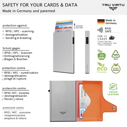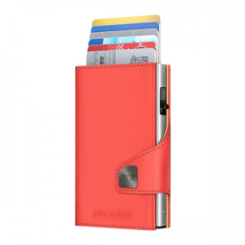 Το πατενταρισμένο πορτοφόλι TRU VIRTU® “CLICK & SLIDE” VEGAN APPLE LEATHER δεν είναι πολύ μεγαλύτερο από μια πιστωτική κάρτα. Με ένα μόνο άγγιγμα του αντίχειρά σας και χωρίς να ανοίξετε το πορτοφόλι, οι κάρτες σας αυτόματα γλιστρούν έξω σε κλιμακωτή θέση.