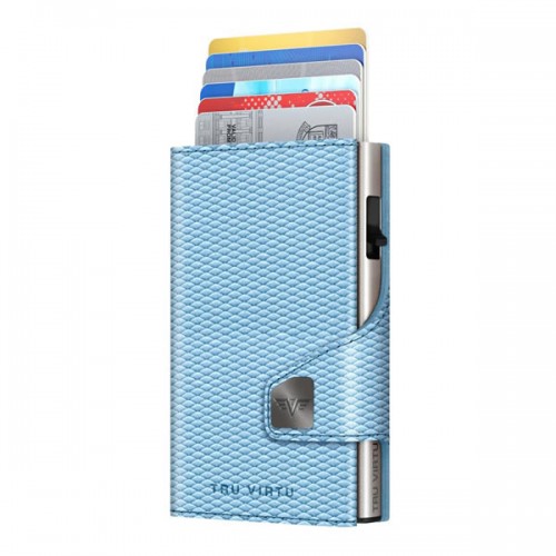 Το πατενταρισμένο πορτοφόλι TRU VIRTU® “CLICK & SLIDE” δεν είναι πολύ μεγαλύτερο από μια πιστωτική κάρτα. Με ένα μόνο άγγιγμα του αντίχειρά σας και χωρίς να ανοίξετε το πορτοφόλι, οι κάρτες σας αυτόματα γλιστρούν έξω σε κλιμακωτή θέση.