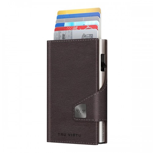 Το πατενταρισμένο πορτοφόλι TRU VIRTU® “CLICK & SLIDE”  δεν είναι πολύ μεγαλύτερο από μια πιστωτική κάρτα. Με ένα μόνο άγγιγμα του αντίχειρά σας και χωρίς να ανοίξετε το πορτοφόλι, οι κάρτες σας αυτόματα γλιστρούν έξω σε κλιμακωτή θέση.