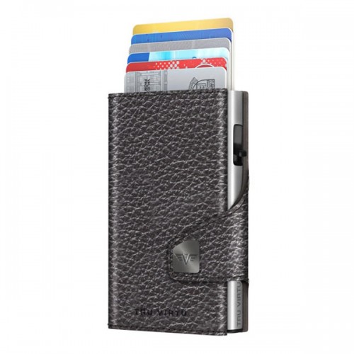 Το πατενταρισμένο πορτοφόλι TRU VIRTU® “CLICK & SLIDE” δεν είναι πολύ μεγαλύτερο από μια πιστωτική κάρτα. Με ένα μόνο άγγιγμα του αντίχειρά σας και χωρίς να ανοίξετε το πορτοφόλι, οι κάρτες σας αυτόματα γλιστρούν έξω σε κλιμακωτή θέση.