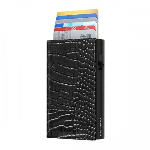 Το πατενταρισμένο πορτοφόλι TRU VIRTU® “CLICK & SLIDE” δεν είναι πολύ μεγαλύτερο από μια πιστωτική κάρτα. Με ένα μόνο άγγιγμα του αντίχειρά σας και χωρίς να ανοίξετε το πορτοφόλι, οι κάρτες σας αυτόματα γλιστρούν έξω σε κλιμακωτή θέση.