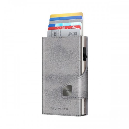 Το πατενταρισμένο πορτοφόλι TRU VIRTU® “CLICK & SLIDE” δεν είναι πολύ μεγαλύτερο από μια πιστωτική κάρτα. Με ένα μόνο άγγιγμα του αντίχειρά σας και χωρίς να ανοίξετε το πορτοφόλι, οι κάρτες σας αυτόματα γλιστρούν έξω σε κλιμακωτή θέση.