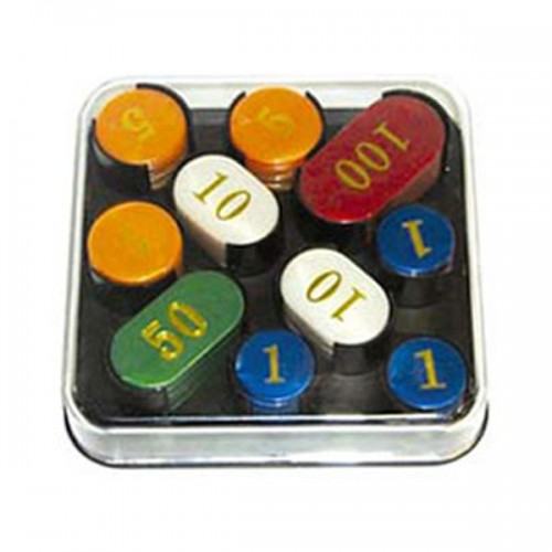 Σετ 100 τεμ. μάρκες πολυεστερικές με αναγραφόμενα ποσά σε πλαστική θήκη.