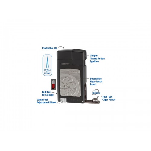 ΑΝΑΠΤΗΡΑΣ FORTE JET FLAME – BLACK ROOM 101 SAKURA ένας premium torch αναπτήρας της XIKAR που συνδυάζει κομψό μαύρο μεταλλικό σώμα με το συλλεκτικό καλλιτεχνικό ένθετο Room 101 Sakuraπροσφέροντας ξεχωριστή αισθητική και ιαπωνικό χαρακτήρα διαθέτει ισχυρή μονή jet φλόγα με υψηλή αντοχή στον άνεμο, ιδανική για άναμμα πούρων σε εσωτερικούς και εξωτερικούς χώρους ο εργονομικός σχεδιασμός του επιτρέπει άνετη χρήση με το ένα χέρι ενώ το μεγάλο ρυθμιστικό φλόγας και το παράθυρο καυσίμου προσφέρουν απόλυτο έλεγχο και ευκολία η στιβαρή μεταλλική κατασκευή του εξασφαλίζει αντοχή και μακροχρόνια χρήση αποτελώντας ένα κορυφαίο εργαλείο που συνδυάζει λειτουργικότητα, ανθεκτικότητα και ξεχωριστό artistic design για απαιτητικούς
